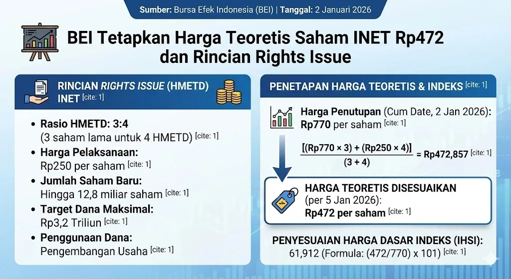 Sesuai ketentuan fraksi harga, harga teoretis saham INET di sistem JATS untuk Pasar Reguler dan Pasar Negosiasi per 5 Januari 2026 disesuaikan menjadi Rp472 per saham.