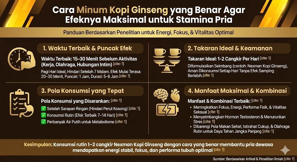 Namun, untuk mendapatkan hasil maksimal, cara minum kopi ginseng harus tepat. Waktu konsumsi, dosis, dan pola minum sangat memengaruhi seberapa besar manfaat yang bisa dirasakan tubuh.