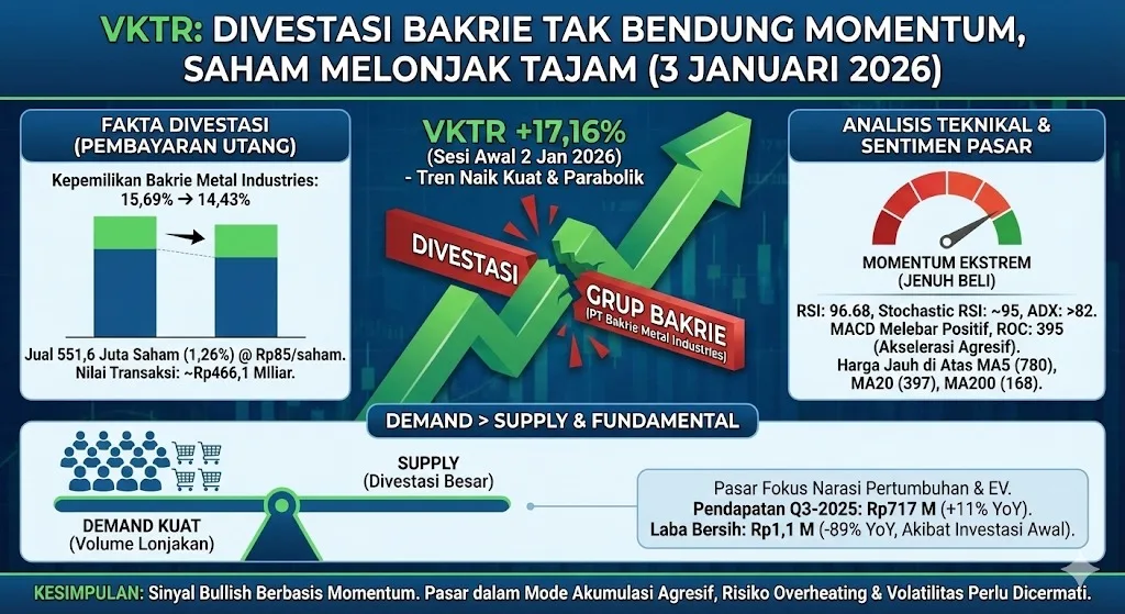 Jakarta, 3 Januari 2026 — Aksi divestasi saham oleh Grup Bakrie terhadap PT VKTR Teknologi Mobilitas Tbk (VKTR) justru disambut positif oleh pasar. Meski penjualan dilakukan untuk kebutuhan pembayaran utang, pergerakan saham VKTR malah menguat tajam, didorong momentum teknikal agresif dan optimisme investor terhadap narasi kendaraan listrik (EV).