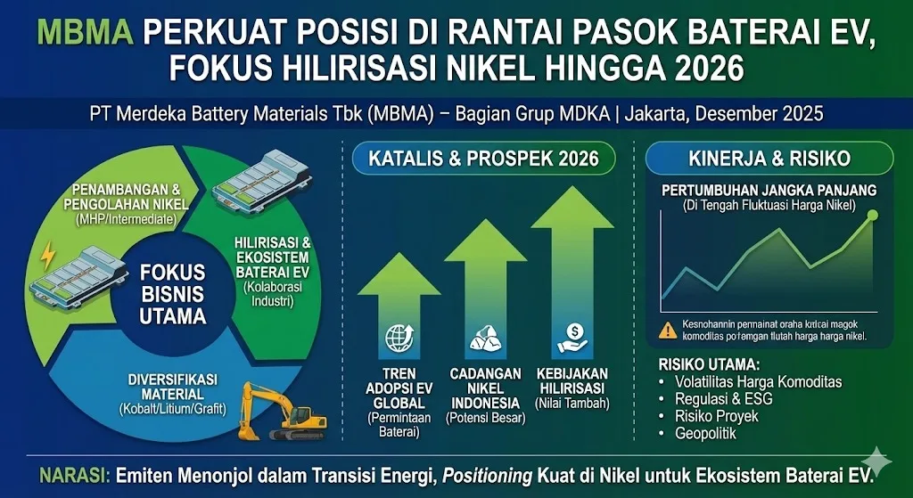 Secara narasi, MBMA menjadi salah satu emiten yang menonjol dalam tema besar transisi energi, terutama karena positioning-nya di nikel dan hilirisasi untuk mendukung ekosistem baterai EV. Meski begitu, investor tetap perlu memantau realisasi proyek, perkembangan harga nikel, serta aspek ESG dan kebijakan global yang berpotensi memengaruhi rantai pasok baterai.