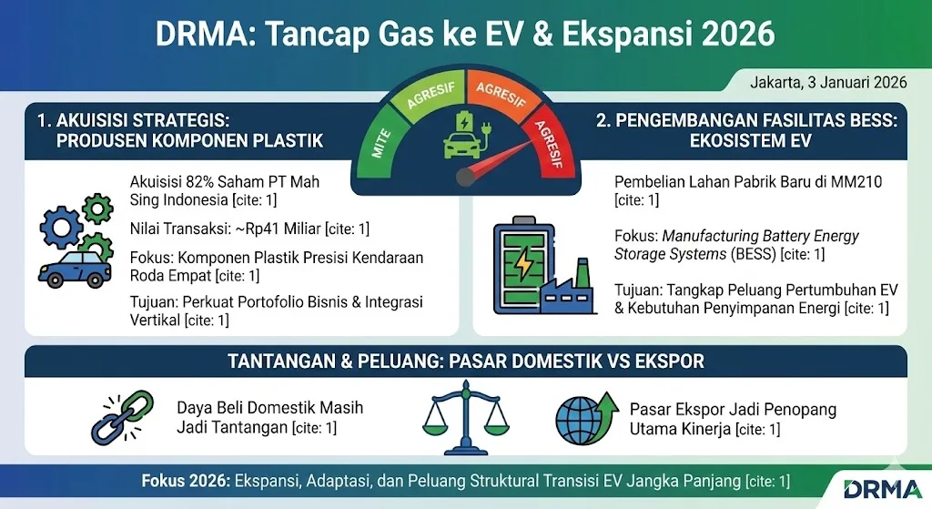 Jakarta, 3 Januari 2026 — PT Dharma Polimetal Tbk (DRMA) menunjukkan langkah agresif dalam menangkap peluang bisnis kendaraan listrik (EV) dan ekosistem pendukungnya pada 2026. Produsen suku cadang otomotif ini menyiapkan ekspansi melalui akuisisi strategis serta pengembangan fasilitas produksi baru untuk memperkuat posisi di rantai pasok EV nasional.
