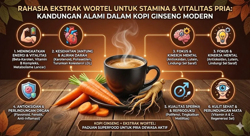 Beberapa penelitian menunjukkan bahwa antioksidan alami seperti beta-karoten dan polifenol dari wortel dapat meningkatkan motilitas sperma dan kualitas hormon pria. Kombinasi dengan ginseng akan memperkuat efek vitalitas, menjadikan minuman seperti kopi ginseng wortel sebagai solusi alami untuk meningkatkan performa pria secara menyeluruh.