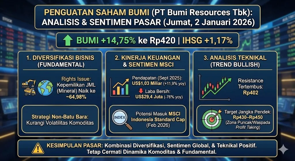 Kombinasi strategi diversifikasi, sentimen indeks global, dan konfirmasi teknikal menjadikan saham BUMI sebagai salah satu saham paling aktif diperdagangkan di awal 2026. Meski prospek jangka pendek masih positif, pelaku pasar disarankan tetap mencermati dinamika harga komoditas dan perkembangan kinerja fundamental perseroan ke depan.