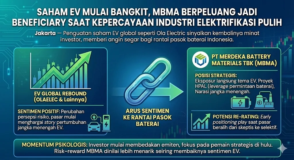 Meski masih volatil, pergerakan OLAELEC mulai dibaca sebagai perubahan sentimen, dari skeptisisme ekstrem menuju pendekatan yang lebih selektif dan konstruktif terhadap industri EV. Kondisi ini menjadi penting, karena pasar EV kerap berfungsi sebagai leading indicator bagi rantai pasok material baterai.