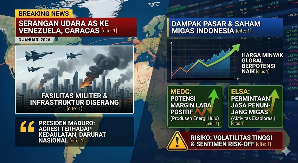 Secara keseluruhan, serangan Amerika Serikat ke Venezuela menciptakan dampak kompleks bagi pasar energi dan saham migas Indonesia. Harga minyak yang berpotensi menguat menjadi sentimen positif bagi MEDC dan ELSA, namun volatilitas pasar dan risiko geopolitik dapat membatasi penguatan harga saham dalam jangka pendek.