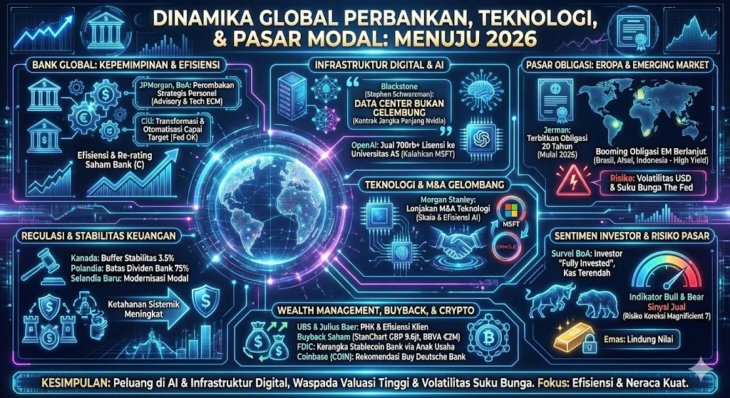 Jakarta — Perkembangan sektor keuangan global memasuki fase yang semakin kompleks menjelang 2026. Mulai dari perombakan kepemimpinan bank besar, lonjakan aktivitas obligasi pasar berkembang, ekspansi infrastruktur digital, hingga meningkatnya spekulasi di pasar saham dan kripto, seluruhnya membentuk lanskap investasi yang penuh peluang sekaligus risiko.