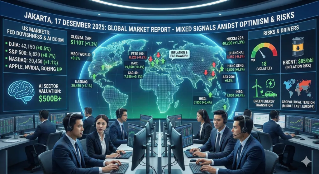 Jakarta, 17 Desember 2025 — Perkembangan pasar saham global pada perdagangan 17 Desember 2025 menunjukkan pergerakan campuran dengan kecenderungan positif, didorong oleh optimisme pasar terhadap arah kebijakan moneter Amerika Serikat yang semakin longgar serta berlanjutnya pemulihan ekonomi global.